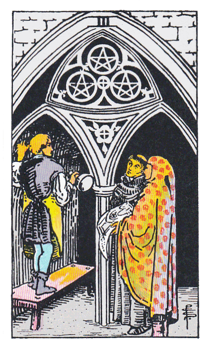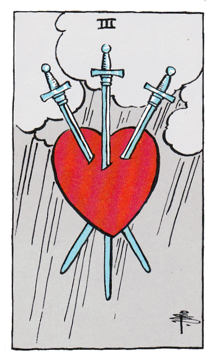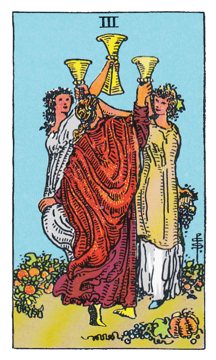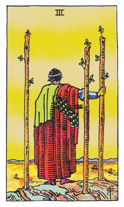 Tarot associations are the Four Threes: Wands symbolising Opportunity; Cups symbolising Happiness; Swords symbolising Conflict; Pentacles pointing to Business or Potential.
