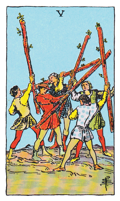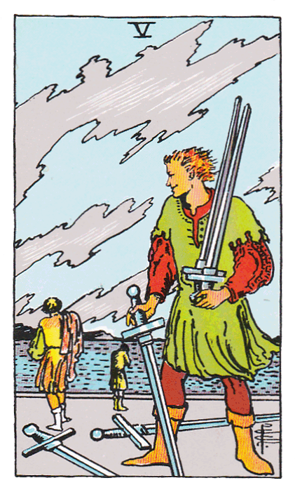 The four 5’s of the Tarot fit in here, because they are all attributed to strife, trouble, defeat or loss of pleasure.