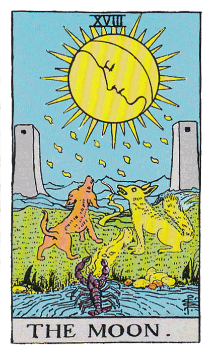 The image of the Moon on the Tarot key is shown with 16 large and 16 small rays, making 32 in all, to represent the 32 Paths of Wisdom. The esoteric interpretation is that the Moon itself is the radius, which is our first point of contact with psychic and spiritual opening. In its association with the subconscious, the seat of soul, it is our perpetual guardian which never sleeps. Paul Case interprets the two dogs, one more wolf-like than the other, to be the poles of nature and art. All corporeal existence is portrayed unfolding in the Tarot key in sequence. At the bottom near the pool are stones and plants, symbolising the mineral and vegetable kingdoms, the crayfish, symbol of the first stirrings of consciousness, after being bathed in the waters of wisdom, and the animal kingdom represented by the dog and the wolf, wailing their lament to the Moon, calling to Artemis, mistress of wild beasts.