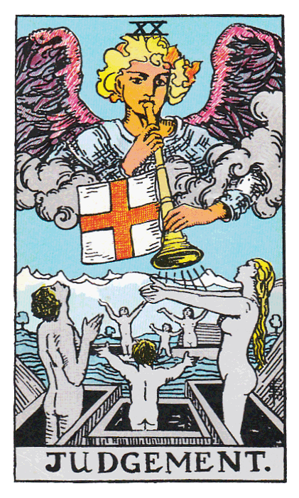 The 31st path and 20th Arcanum commences on the negative pillar joining Hod with Malkuth. Influenced by the element of Fire, it is depicted by an archangel awakening the dead. The naked child is the balance between positive and negative aspects and also represents rebirth or the beginning of a new cycle.